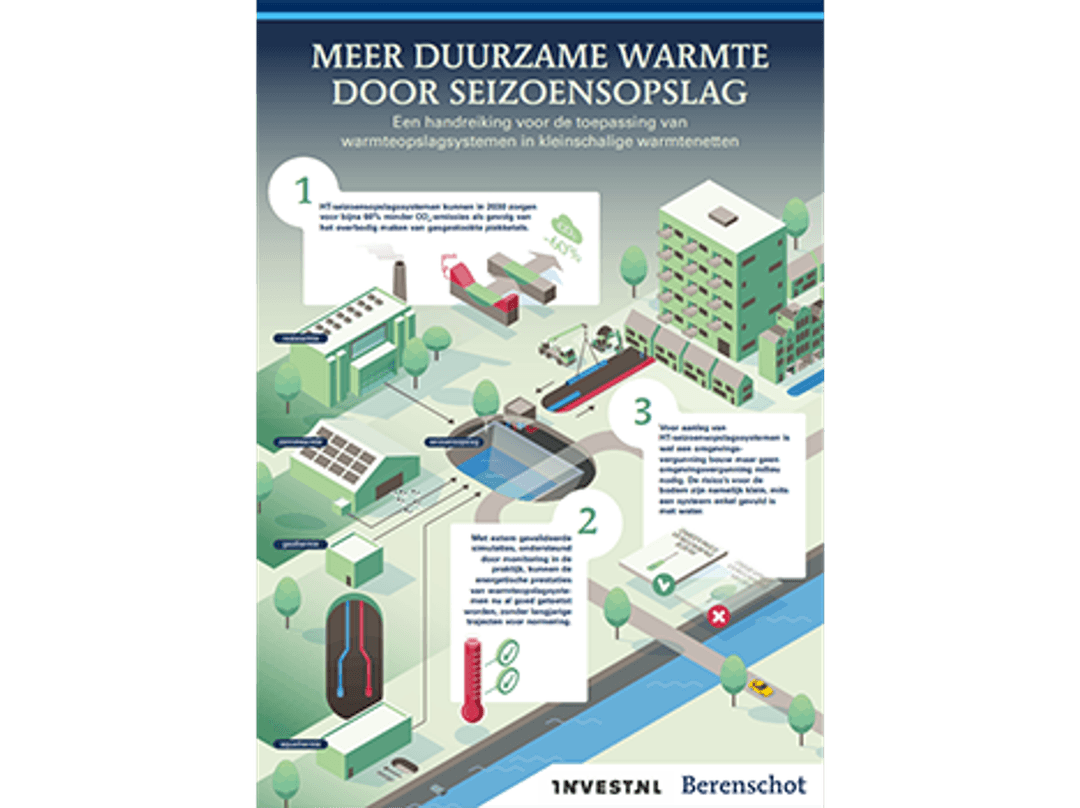 Thermal storage is profitable and relevant. Earlier Invest-NL research into opportunities for heat storage systems (‘Kansen thermische opslagsystement’) calculated a market potential of 45 PJ in 2050. Up to 2035, this translates into a market value of € 500 million. It also creates significant social return: adding buffers reduces the use of gas-fired peak boilers and makes heat networks more flexible and future-proof. Yet businesses developing heat storage technologies are still struggling to gain a foothold in heat projects. Cold feet among initiators of heat projects are a major barrier. In response to this, Invest-NL commissioned Berenschot to develop concrete tools and guidelines for initiators such as municipalities, heat cooperatives and project developers.